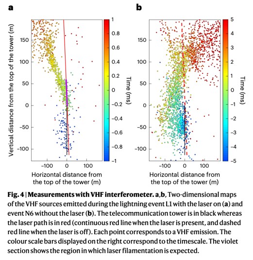 Running the laser during thunderstorms, the research team observed at least a dozen lightning strokes that did not follow the laser’s path, along with four upward strokes that began at the tower tip, bridged to the filament, and then rode upward along the filament before discharging into the cloud above. One stroke was captured—in the images above—by cameras. The remaining flashes were confirmed by the emission of very high frequency (VHF) radio waves and X-rays emitted along the path of the lightning. The VHF emissions can be triangulated by two measuring antennas, mapping and timing the path of the lightning bolt to create a compelling case that the lightning travels along the laser path. The images sell the story, but the VHF maps are the hard data.