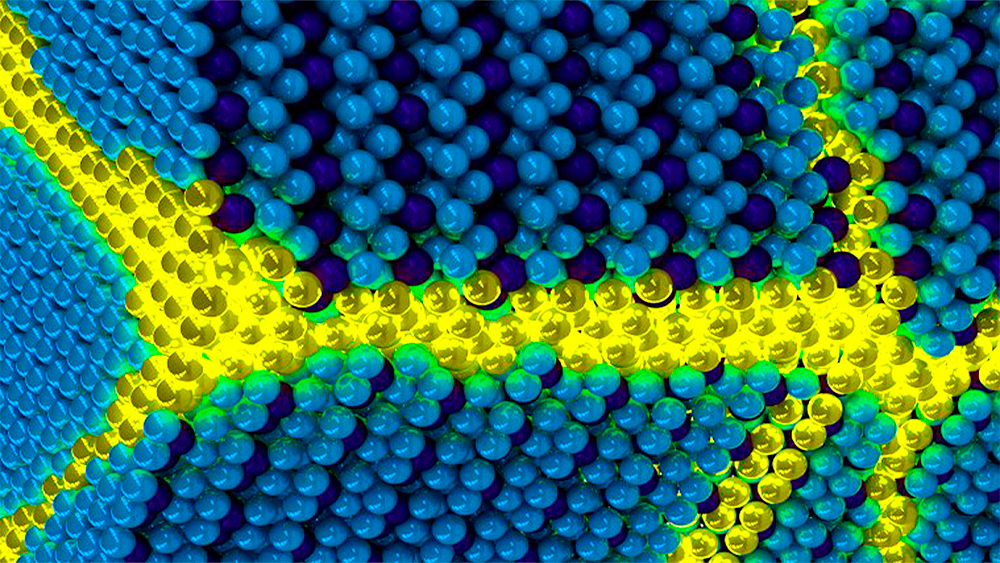 An artist’s depiction of the collective excitons in an excitonic solid. These excitations are propagating domain walls (yellow) in an ordered solid exciton background (blue). Credit: Peter Abbamonte, University of Illinois at Urbana-Champaign Department of Physics and Frederick Seitz Materials Research Laboratory.
