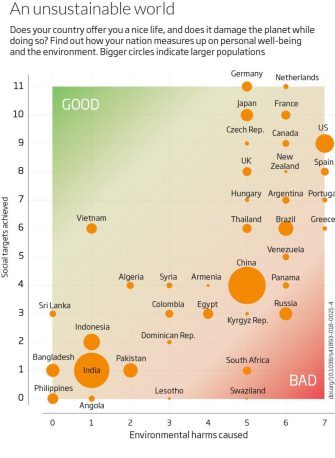 The gist of the results: Rich nations give citizens comfy lives but far overshoot the limits of sustainability, poor nations do the opposite.