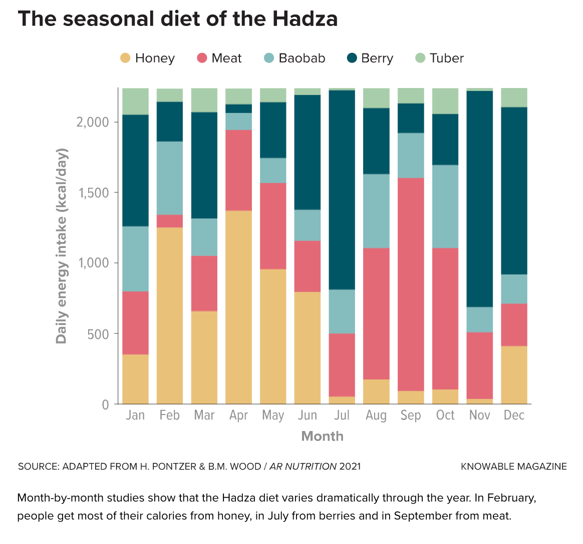 In the 2021 Annual Review of Nutrition, Pontzer and his colleague Brian Wood, of the University of California, Los Angeles, describe what we can learn about the eating habits of our ancestors by studying modern hunter-gatherer populations like the Hadza in northern Tanzania and the Aché in Paraguay. In an interview with Knowable Magazine, Pontzer explains what makes the Hadza’s surprisingly seasonal, diverse diets so different from popular notions of ancient meals.