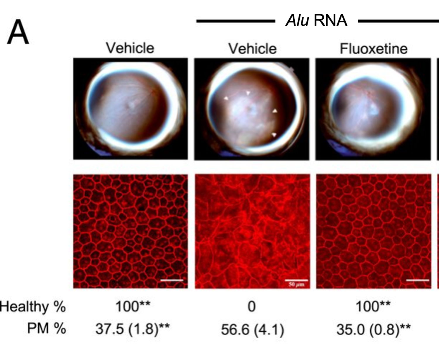 It is not enough to show that fluoxetine shares a structure with a molecule that blocks the danger signal; the researchers also needed to illustrate that fluoxetine treatment can prevent cell death under the conditions that lead to AMD — that is, when Alu-encodedRNA transcripts build up in retinal cells.
