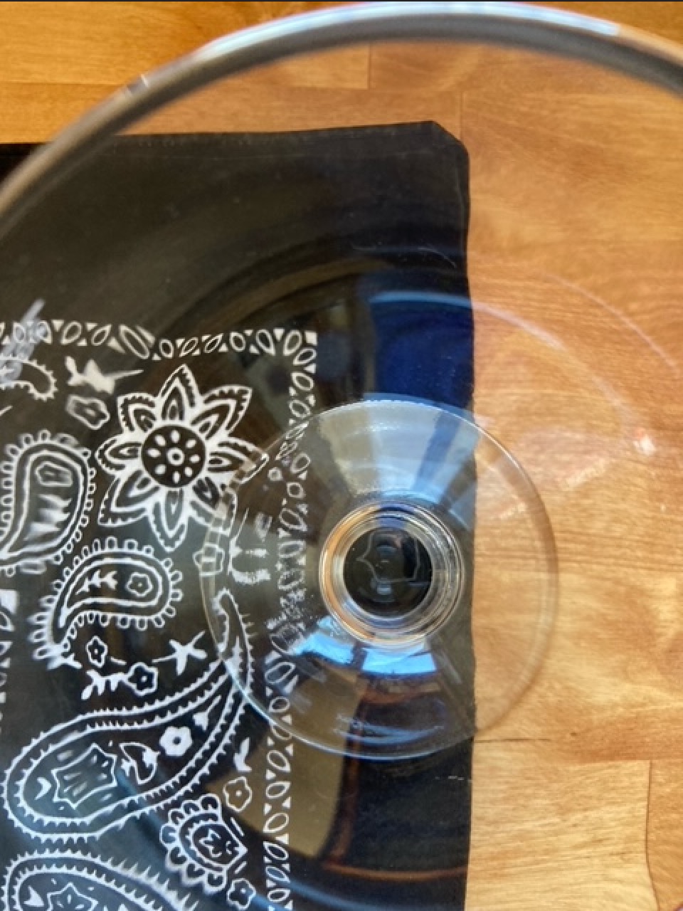 When the glass is empty, take a careful look at the inside. The nucleation sites are tiny pits etched into the bottom of the glass. You can see them in the glass below, above the stem and just below the index finger, arranged in a tiny outline of the CHIMAY beer company’s shield crest logo.