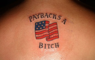 A brand new tattoo on a woman’s back expresses her desire for revenge. In 2001, Addictions Tattoo in Midway City, CA, was giving away free tattoos that express the feelings of nationalism that swept the US in anticipation of America’s retaliation for the 9/11 terror attacks. (Photo by David McNew/Getty Images)
