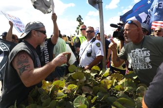 John Pope (L) expresses his disagreement with supporters of President Donald Trump near the Mar-a-Lago resort home of President Trump on March 4, 2017, in West Palm Beach, Florida. President Trump spent part of the weekend at the house. (Photo by Joe Raedle/Getty Images)