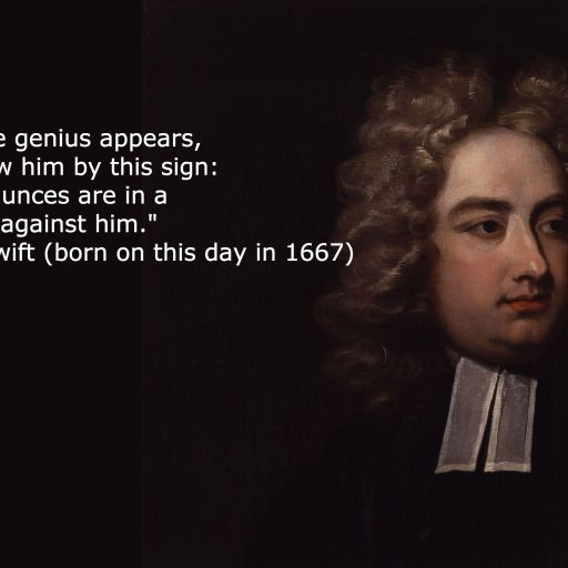 "When a true genius appears, you can know him by this sign: that all the dunces are in a confederacy against him." -Jonathan Swift (born on this day in 1667)
