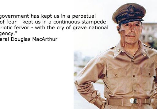 "Our government has kept us in a perpetual state of fear - kept us in a continuous stampede of patriotic fervor - with the cry of grave national emergency."- General Douglas MacArthur (born on this date in 1880)