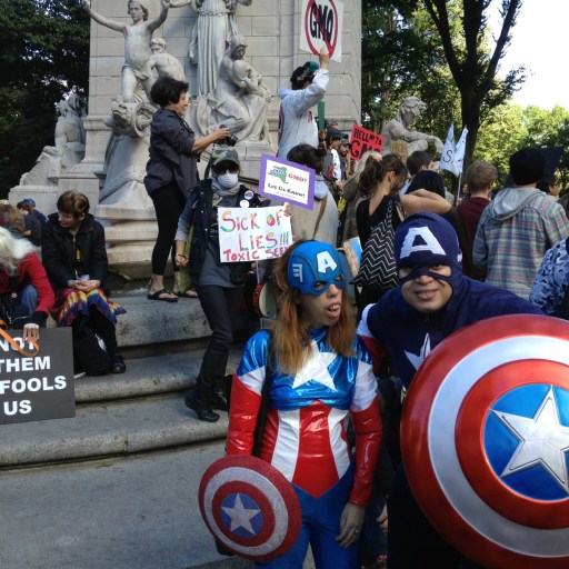 The image above shows the convergence of an anti-GMO protest outside Central Park and the overflow of superheroes and superhero lookalikes in New York City.