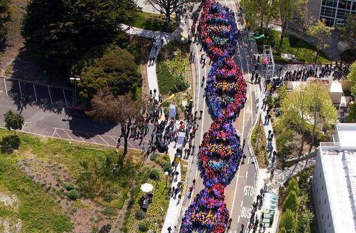 Over 2,600 employees from the San Francisco headquarters of Genentech celebrated the anniversary of the discovery of DNA by forming a human DNA strand reportedly the world's largest ever.