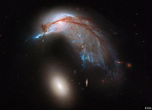 The European Space Agency and NASA's Hubble Space Telescope produced this image of two galaxies known as Arp 142 that strongly resembles a penguin guarding an egg.