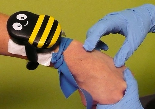 To kids and adults who fear injections, Buzzy looks like a plastic toy. However, when applied to the skin, its vibrating motor and ice pack block the pain of the needle.