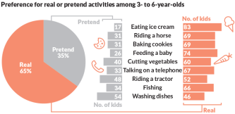 Here we examined, for nine different activities, American middle-class preschoolers’ preferences for pretend and real activities. The 100 children we tested (M = 58.5 months, range 36 to 82 months) overwhelmingly preferred real activities to pretend ones, and this preference increased from age 3 to age 4, then remained steady through age 6. Children provided cogent justifications for their preferences.
