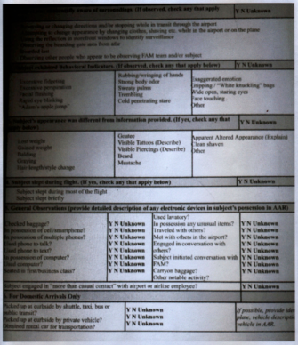 A few dozen people aboard domestic flights are surveilled by undercover federal air marshals (FAMs) every day, according to the report. The air marshals collect basic information on civilian passengers, like hairstyle and whether the person has a tattoo or piercing. But a TSA checklist obtained by the Globe shows how the marshals also collect surprisingly detailed observations on passengers, such as whether they display an “Adam’s apple jump,” use the bathroom, touch their face, appear to be “white knuckling” their bags, or display a “cold penetrating stare.”