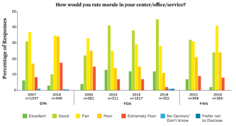 Scientists with the Environmental Protection Agency seemed to report the highest dissatisfaction in the survey, with morale at an all-time low compared to survey results over the past decade, and with 81 percent of scientists agreeing or strongly agreeing that political influence was a problem.