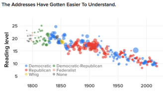 Considering “American” has four syllables and “tremendous” has three, the Flesch-Kincaid Grade Level test may not give much indication as to how thoughtful or intelligent any speech is. Trump’s score indicates what was evident to all who watched the address: he stuck to the script and upped his game. It’s also a sign of a broader trend: the addresses have only been delivered to the public verbally since 1913 with the advent of radio, and were until then circulated as a written letter. As BuzzFeed News reports, since George Washington’s inaugural State of the Union Address in 1790, the reading level has steadily declined, which is in tune with the democratization of politics and media, and the change of format from written to verbal address. Presidents, it seems, are more relatable that ever.