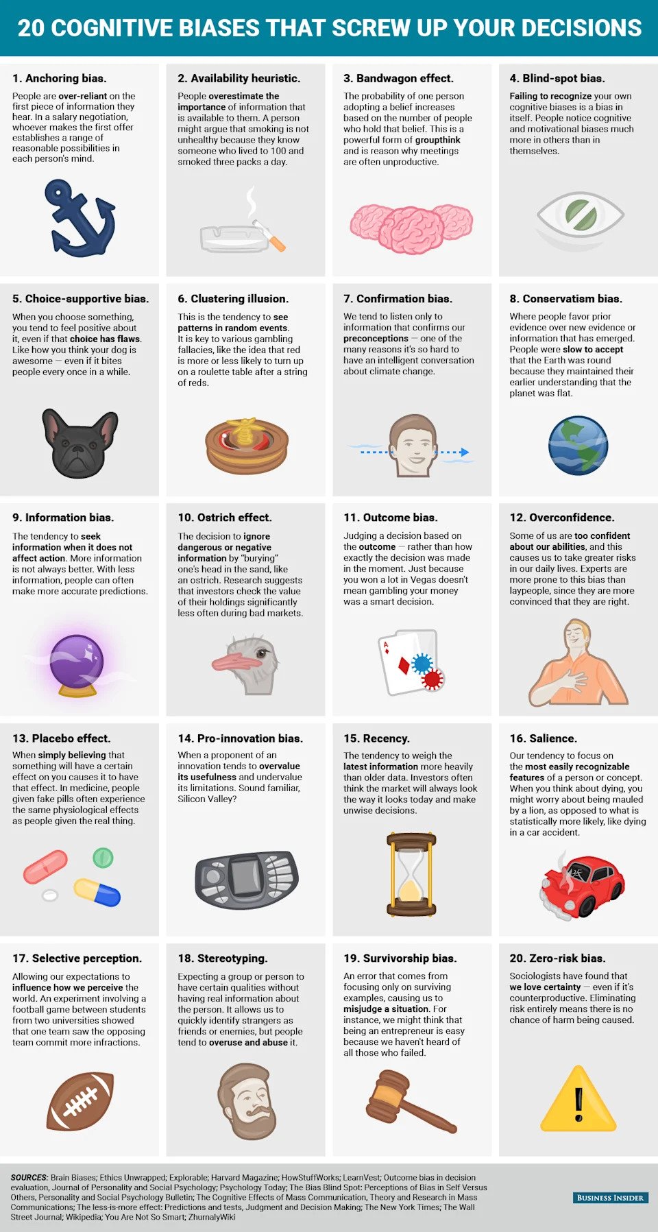 At Business Insider, Samantha Lee put together a great infographic showing 20 cognitive biases that can get in the way of solid decision-making.