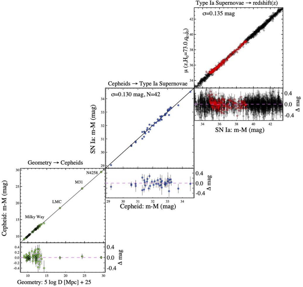 Adam Riess (AR): The 1990’s really started the era of “Precision Cosmology.” The Hubble Space Telescope gave us a new superpower, the ability to resolve individual Cepheid variable stars in galaxies tens of megaparsecs (30-60 million light years) away. Cepheids were then, and still are, the gold standard of distance measuring tools. Two teams led efforts to measure the Hubble constant (the expansion rate of the Universe), using Cepheids to construct distance ladders between our local neighborhood and deep, expanding space.