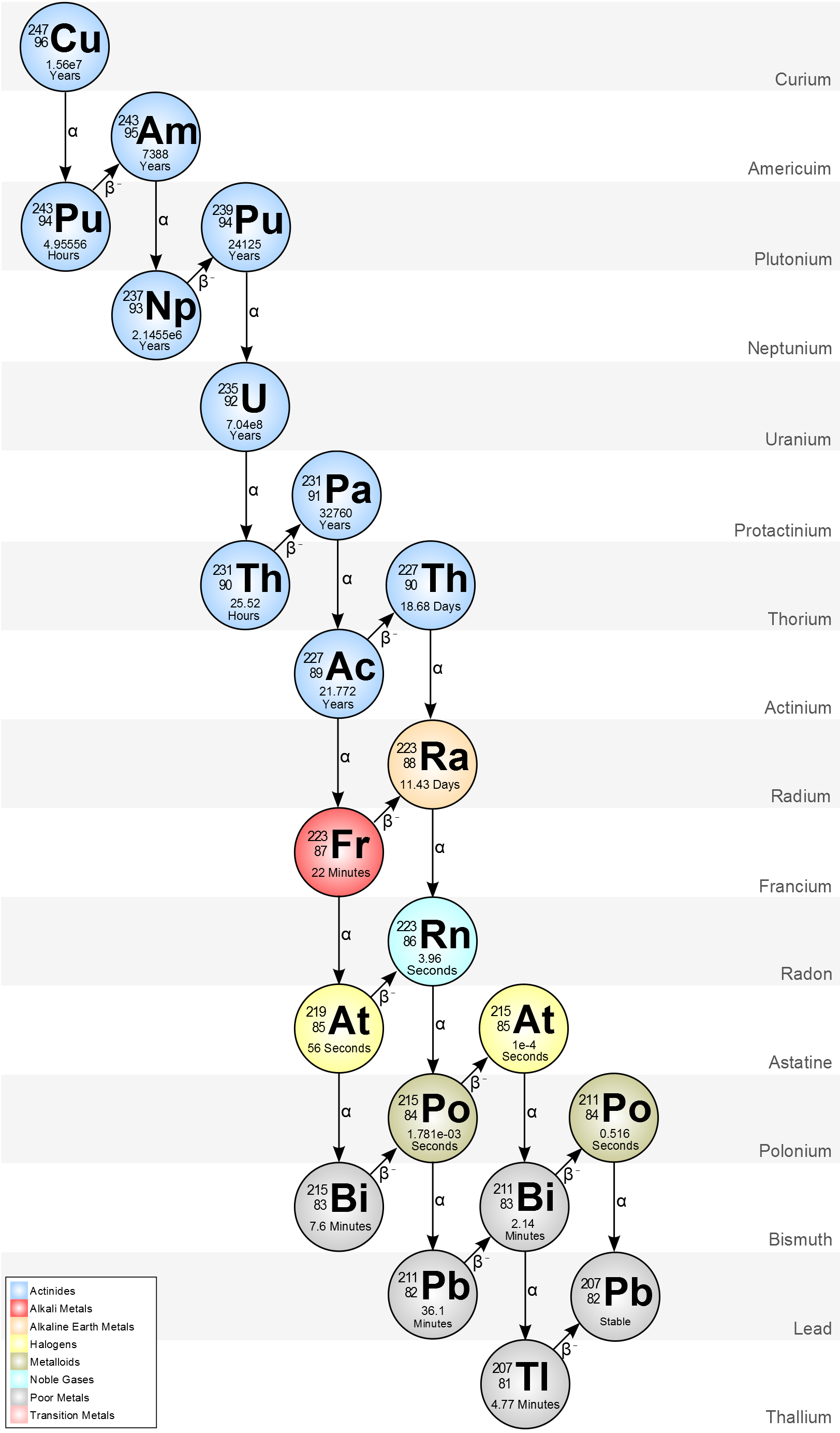 Curium, element 96 on the periodic table, may be produced in some stellar cataclysms, but decays away before it can persist in planets like Earth. Radioactive decay chains like this produce many elements that are naturally produced in no other sustaining fashion. (Credit: BatesIsBack/Wikimedia Commons and Chloe Reynolds/UC Berkeley)
