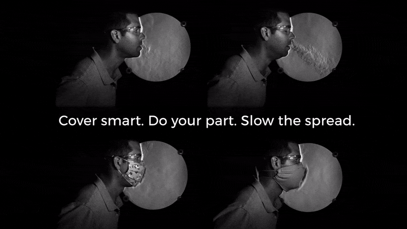 An unmasked individual doing something as simple as exhaling (top) can send droplet particles large distances, with a high potential for spreading the novel SARS-CoV-2 coronavirus. Wearing a mask (bottom) significantly reduces the distance that droplets travel, offering some measure of protection to others as well as, to a lesser extent, the wearer. (Credit: Matthew Staymates et al., NIST)
