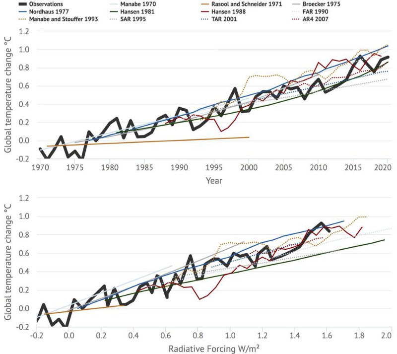 The predictions of various climate models over the years which they made predictions (colored lines) as compared with the observed global average temperature as compared with the 1951–1980 average (black, thick line). Note how thoroughly well these models performed historically, and how well the observations continue to fit the data. (Credit: Z. Hausfather et al., Geophys. Res. Lett., 2019)