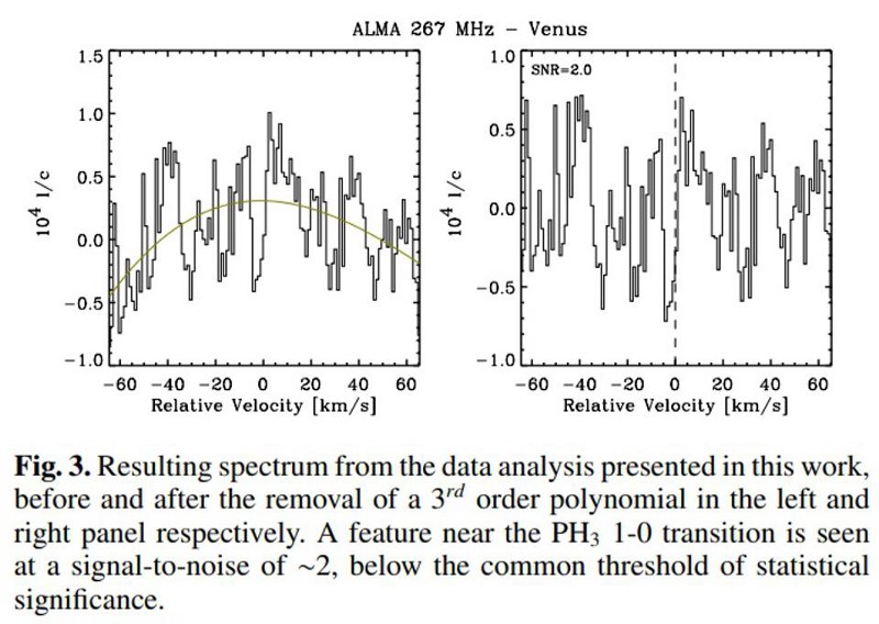 When the raw data from ALMA is looked at on its own, after successful calibration but before the suspicious step in the analysis is applied (left), a signal does not appear at any greater magnitude than the noise profile. When a gentler noise-removal is applied (curved line, at left), only a modest, non-robust signal appears (right), disfavoring a detection of the PH3 molecule. (Credit: Snellen et al., arXiv:2010.09761)