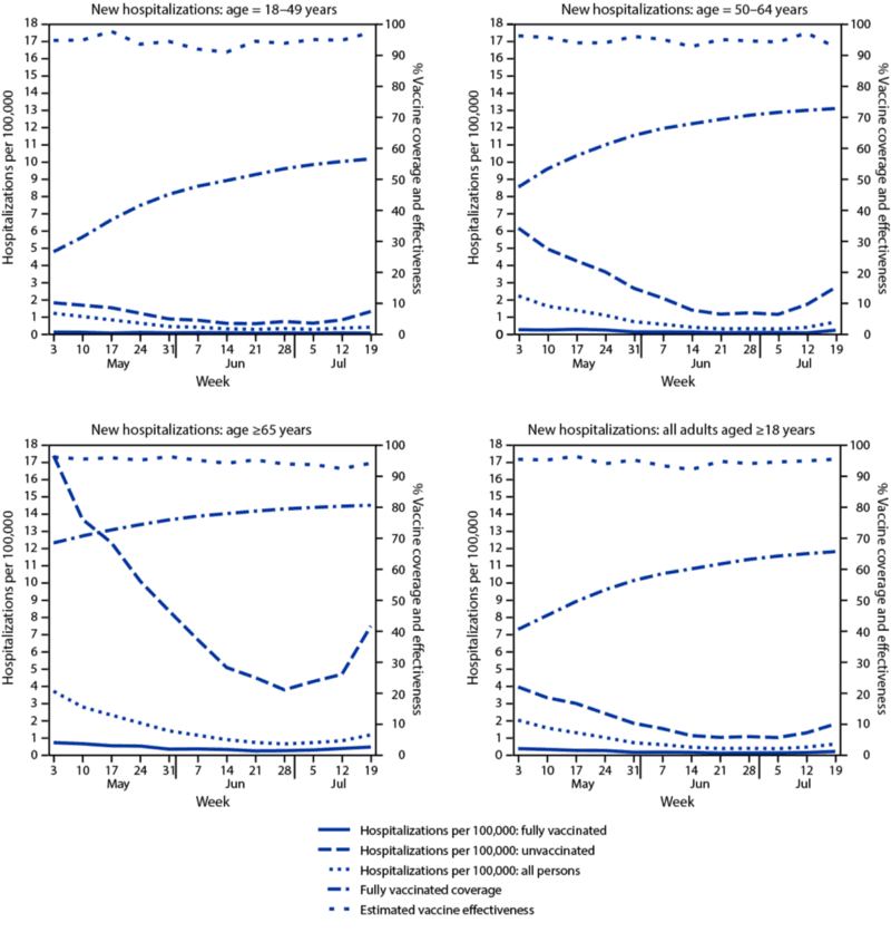 Hospitalization rates in New York for both vaccinated and unvaccinated individuals during the summer of 2021. As you can see, the estimated vaccine effectiveness, which accounts for how much less likely you are to be hospitalized if you’re vaccinated versus unvaccinated, has consistently remained well over 90% for all times and age groups. The hospitalization risks remain significantly reduced for vaccinated individuals even where new variants have emerged. (Credit: Rosenberg E.S. et al., MMWR Morb Mortal Weekly Rep. Epub, 2021)