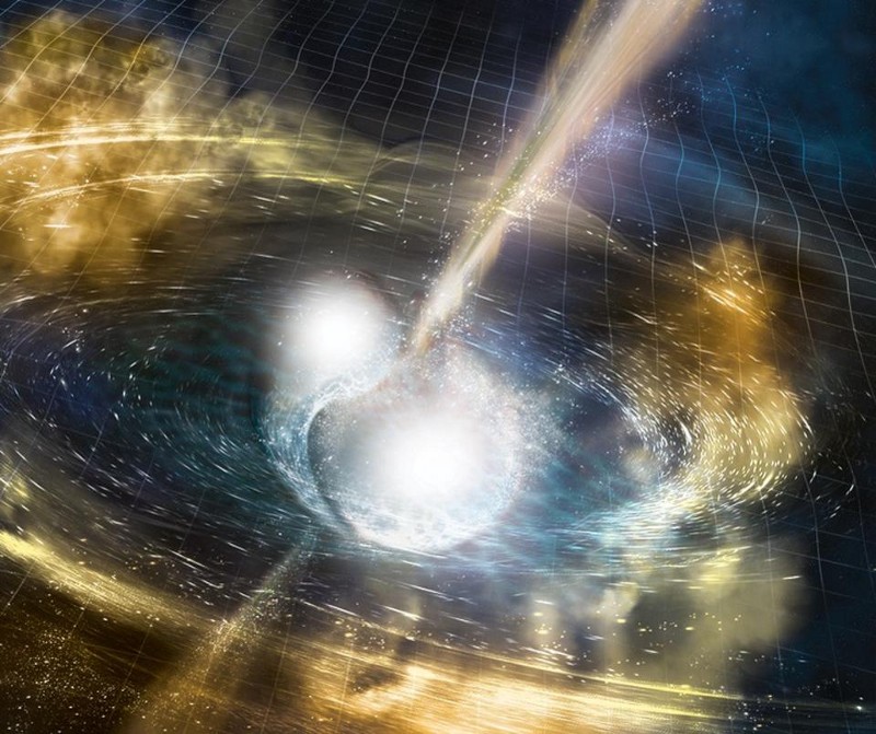 As the neutron stars inspiraled and merged, the gravitational wave signal got stronger and stronger. Unlike with merging black holes, there is no event horizon and no singularity at the core. For neutron stars, there’s a “hard” surface made mostly of neutrons (90%) with other atomic nuclei (and a few electrons) at the edge. When those two surfaces collide with one another, it’s anticipated that a severe, runaway nuclear reaction occurs, resulting in: