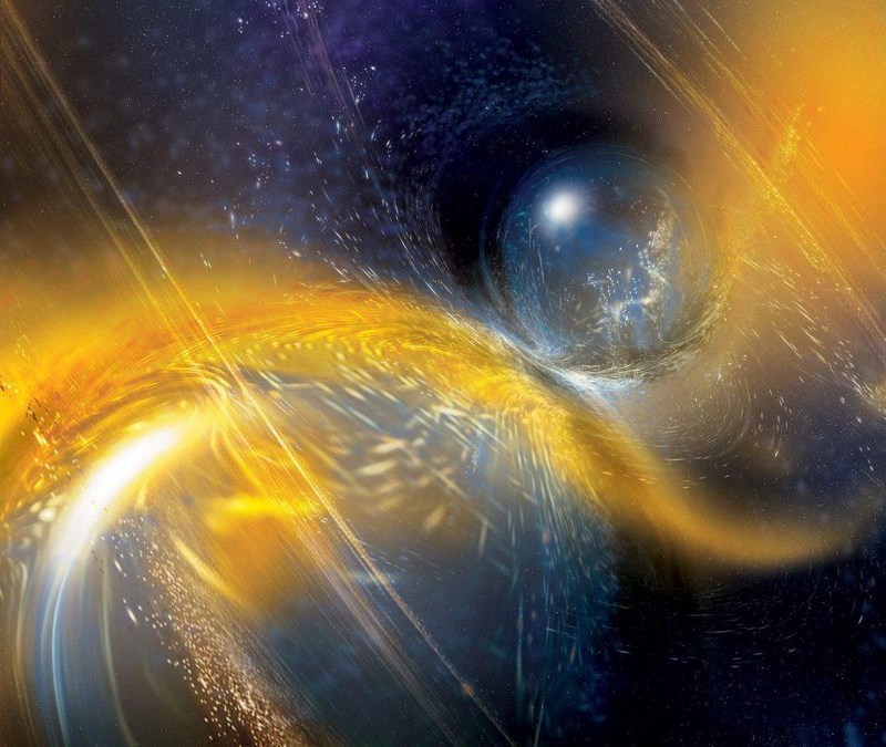 Whenever masses accelerate through curved space, they emit tiny amounts of invisible radiation that’s invisible to all telescopes: gravitational, rather than electromagnetic, radiation. These gravitational waves behave as ripples in the fabric of spacetime, carrying energy away from the system and causing their mutual orbit to decay. At a critical moment in time, these two stellar remnants spiraled so close to one another that they touched, and what followed was one of the most spectacular scientific discoveries of all-time.
