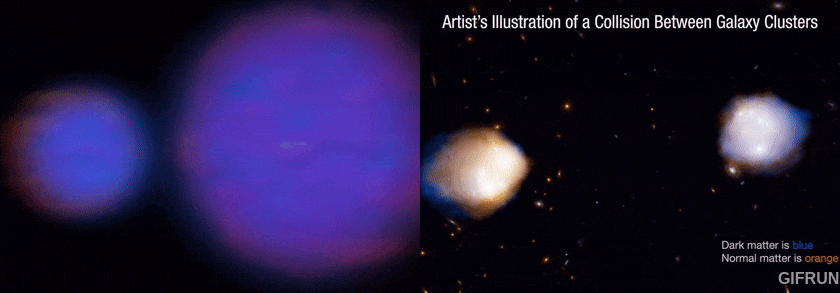 This illustration shows colliding galaxy cluster MACS J0018.5, although rotated to look like what we’d see if viewing it face-on, rather than head-on. The dark matter is shown in blue, sailing ahead of the gas, while the hot gas slows down and exhibits shocks, in orange.