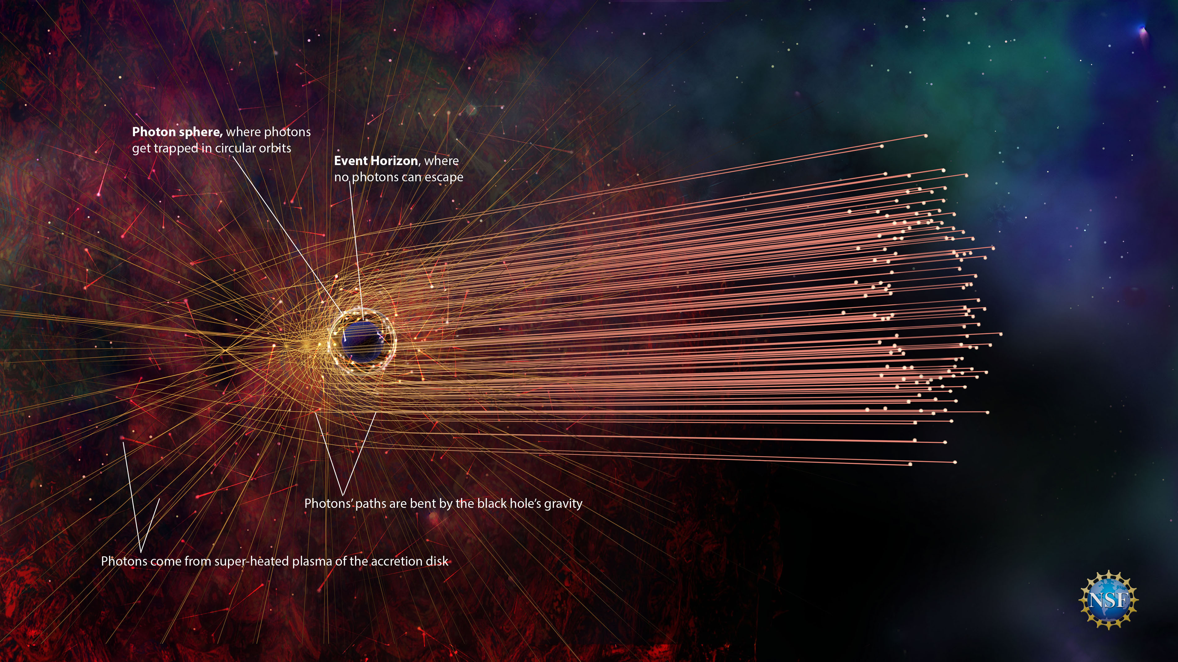 Imagine what it would look like if you had matter that was emitting light omnidirectionally at a black hole. That light would get accelerated around the black hole along all sorts of possible light paths, where each individual photon would wind up moving off in a straight line away from the black hole, but from a different direction’s perspective.