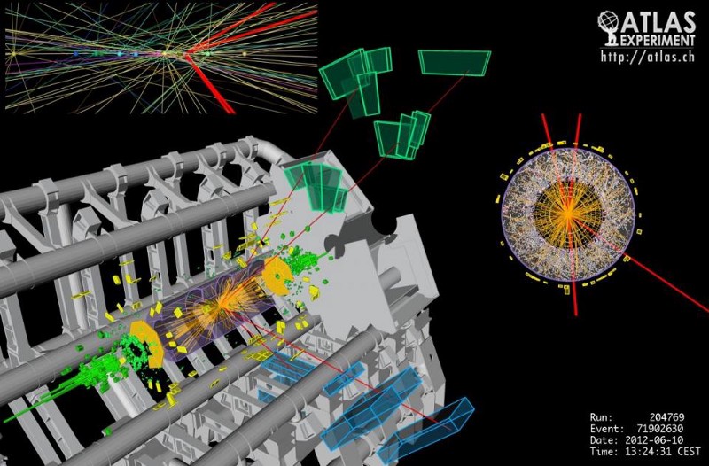 A candidate Higgs event in the ATLAS detector. Note how even with the clear signatures and transverse tracks, there is a shower of other particles; this is due to the fact that protons are composite particles. Image credit: The ATLAS collaboration / CERN.