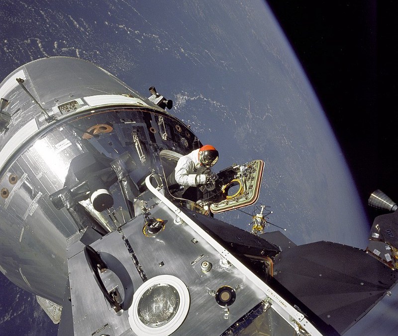 Astronaut Rusty Schweickart on his EVA during the Apollo 9 mission, outside of the Lunar Module. The successful test of life support systems, docking, extraction, and other essential systems and technologies paved the way for a successful Moon landing just months later on Apollo 11.(NASA / APOLLO 9 FILM 19/A)