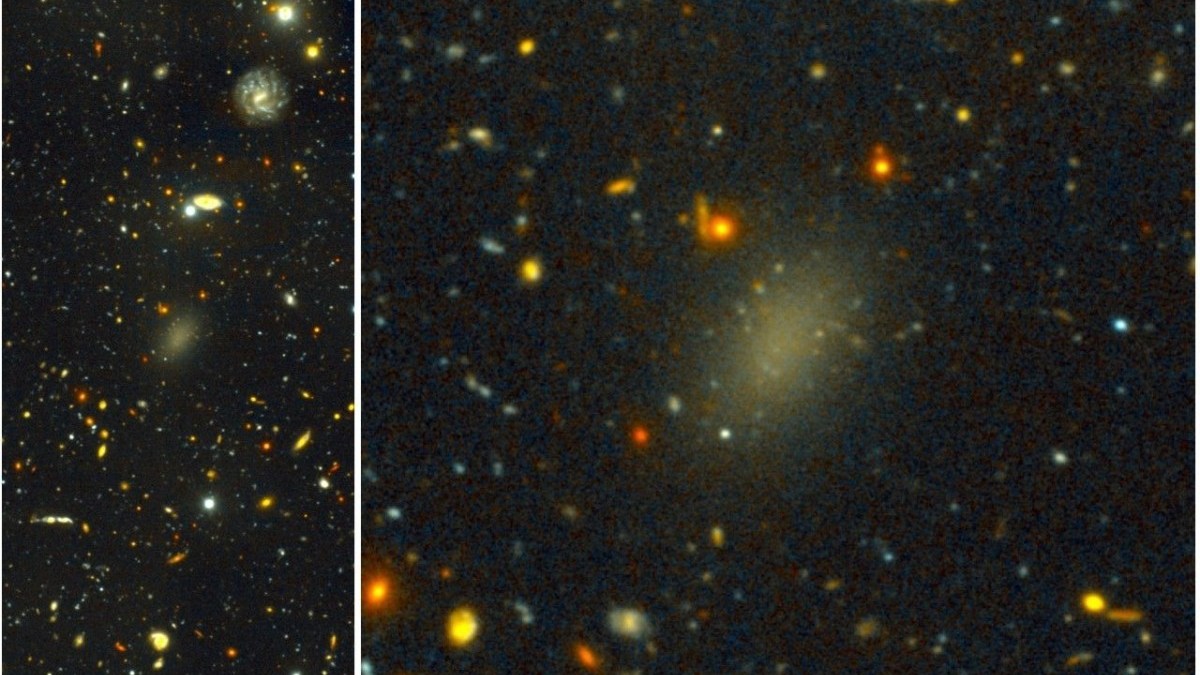 “Dark galaxy” Dragonfly 44, with the same number of stars as the Large Magellanic Cloud but the mass of the Milky Way, as imaged by SDSS (L) and Gemini (R). Image credit: Pieter van Dokkum, Roberto Abraham, Gemini, Sloan Digital Sky Survey.
