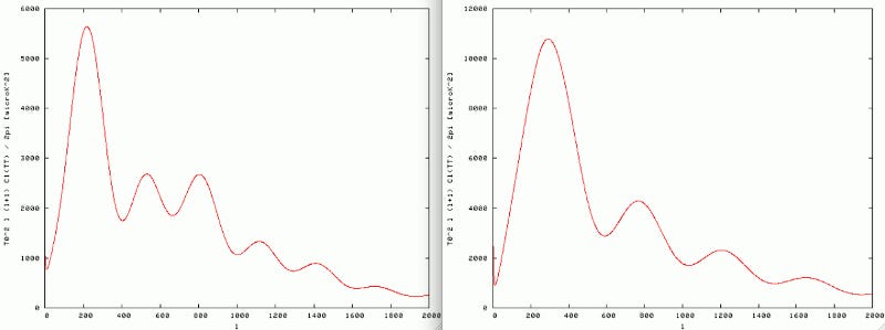 That pattern of fluctuations that you can see, on the graph above, is extremely sensitive to what’s in your Universe. The magnitude and locations of the various peaks and troughs tells us what’s in the Universe, and also rules out models of the Universe that don’t align with the data. For example, if you simulate a Universe with only normal matter and radiation, you’d only get about half of the peaks and valleys that we see, plus the peak would occur on too small of an angular scale, plus the temperature fluctuations would be much larger in magnitude. For this set of observations, dark matter is required.