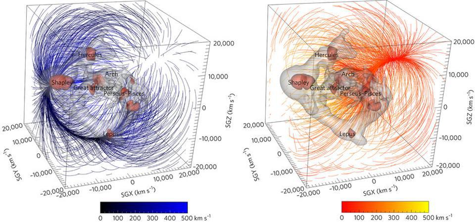 Because matter is distributed roughly uniformly throughout the Universe, it isn’t just the overdense regions that gravitationally influence our motions, but the underdense regions as well. A feature known as the dipole repeller, illustrated here, was discovered only recently, and may explain our Local Group’s peculiar motion relative to the other objects in the Universe. (Credit: Y. Hoffman et al., Nature Astronomy, 2017)