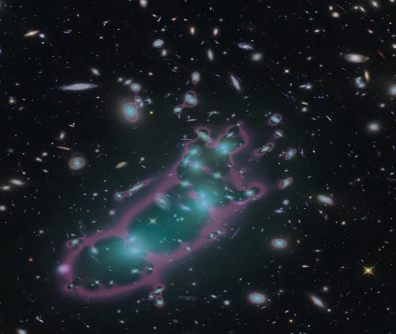 The galaxy cluster MACS 0416 from the Hubble Frontier Fields, with the mass shown in cyan and the magnification from lensing shown in magenta. Image credit: STScI/NASA/CATS Team/R. Livermore (UT Austin).