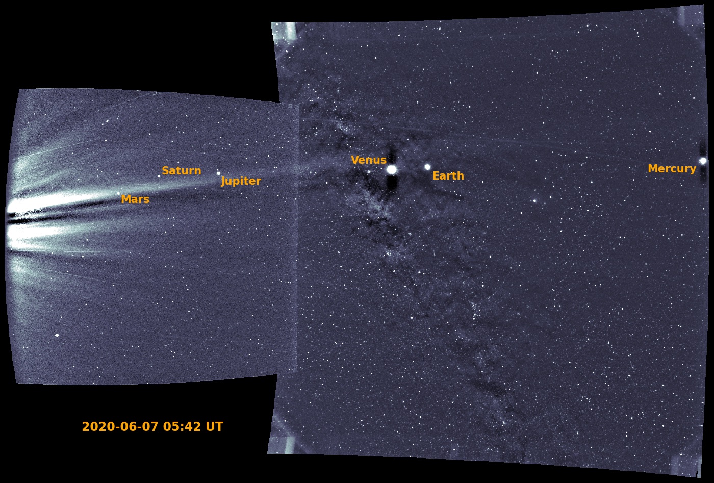 During its 5th perihelion, on June 7, 2020, the Parker Solar Probe looked back toward Earth and was able to spot the Solar System’s innermost six planets all in one frame off to the same side of the limb of the Sun: Mars, Saturn, Jupiter, Venus, Earth, and Mercury, as shown from left-to-right.
