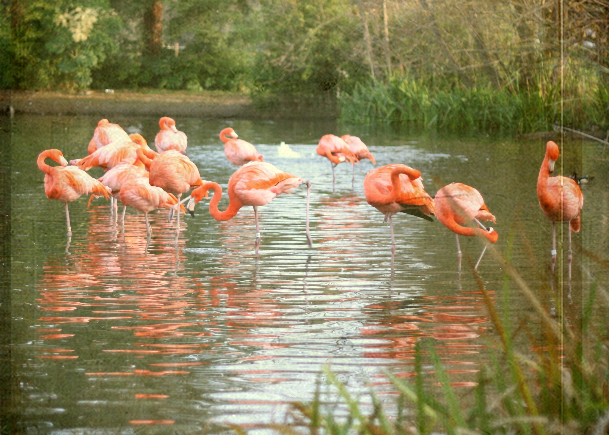 When a flamingo is in the process of feeding, either by stirring up the waters or by plunging its head in to seek bite-sized morsels directly, you’ll find it with both feet in the water. Unlike birds which are diving feeders, like ducks, flamingos only feed with both feet stably on solid ground, even underwater.