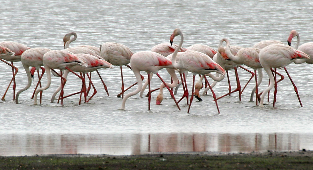 Imagine that you’re a flamingo. You travel as part of a flock for protection. Your long, skinny legs are excellent for enabling you to stand in water as deep as your legs are long while still keeping your body dry and warm. Your webbed feet enable you to stir up seafloor creatures, one foot at a time, by muddying the waters. And your long, flexible neck and bizarre bill, where the the lower portion is longer and thicker than the upper portion, is extremely well-adapted to feeding on the stirred-up algae, crustaceans, larvae, small fish, and other similarly-sized creatures.