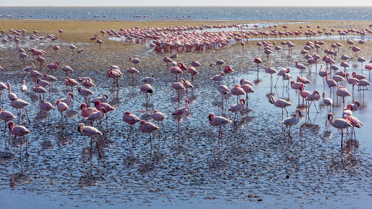 They engage in intricate collective displays, where hundreds or even thousands of flamingos can coordinate head-flag, wing-salute, twist-preen, and marching movements, among others. Flamingos also spend a lot of time preening, where they distribute oil secreted from the base of their tail to their feathers; this helps waterproof the bird’s body. (Flamingos preen up to 3 times longer than most other waterfowl.) And when they bathe, which they typically only do in shallow freshwater, they submerge their entire bodies.