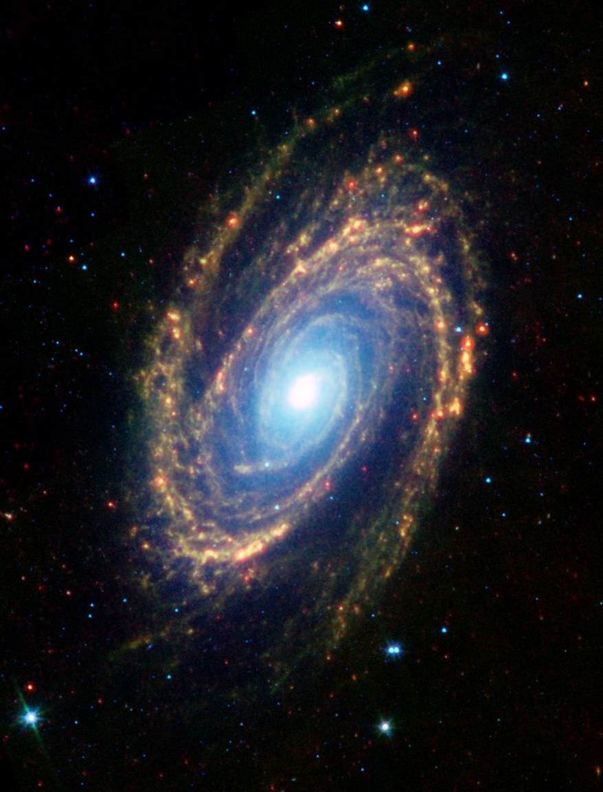 This infrared view of Messier 81 taken by NASA’s Spitzer Space Telescope shows the emitted starlight (in blue) primarily coming from the center, the emission of carbon-based molecules in the interstellar medium (in green), and heated dust also in the interstellar medium (in red). The yellow/orange color showcases a combination of green and red. (Credit: NASA/JPL-Caltech)