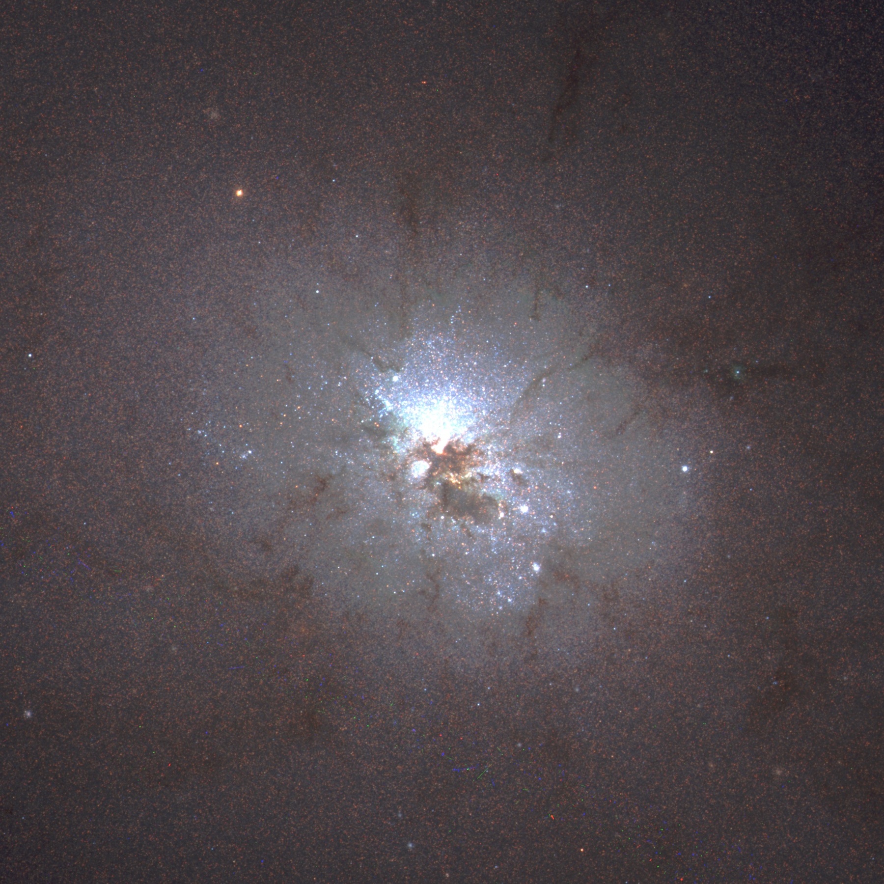 The dusty, irregular galaxy NGC 3077 is actively forming new stars, has a very blue center, and has a hydrogen gas bridge connecting it to M81. One of 34 galaxies in the M81 Group, it’s an example of gravitational interactions triggering new star-formation. (Credit: ESA/Hubble and NASA)