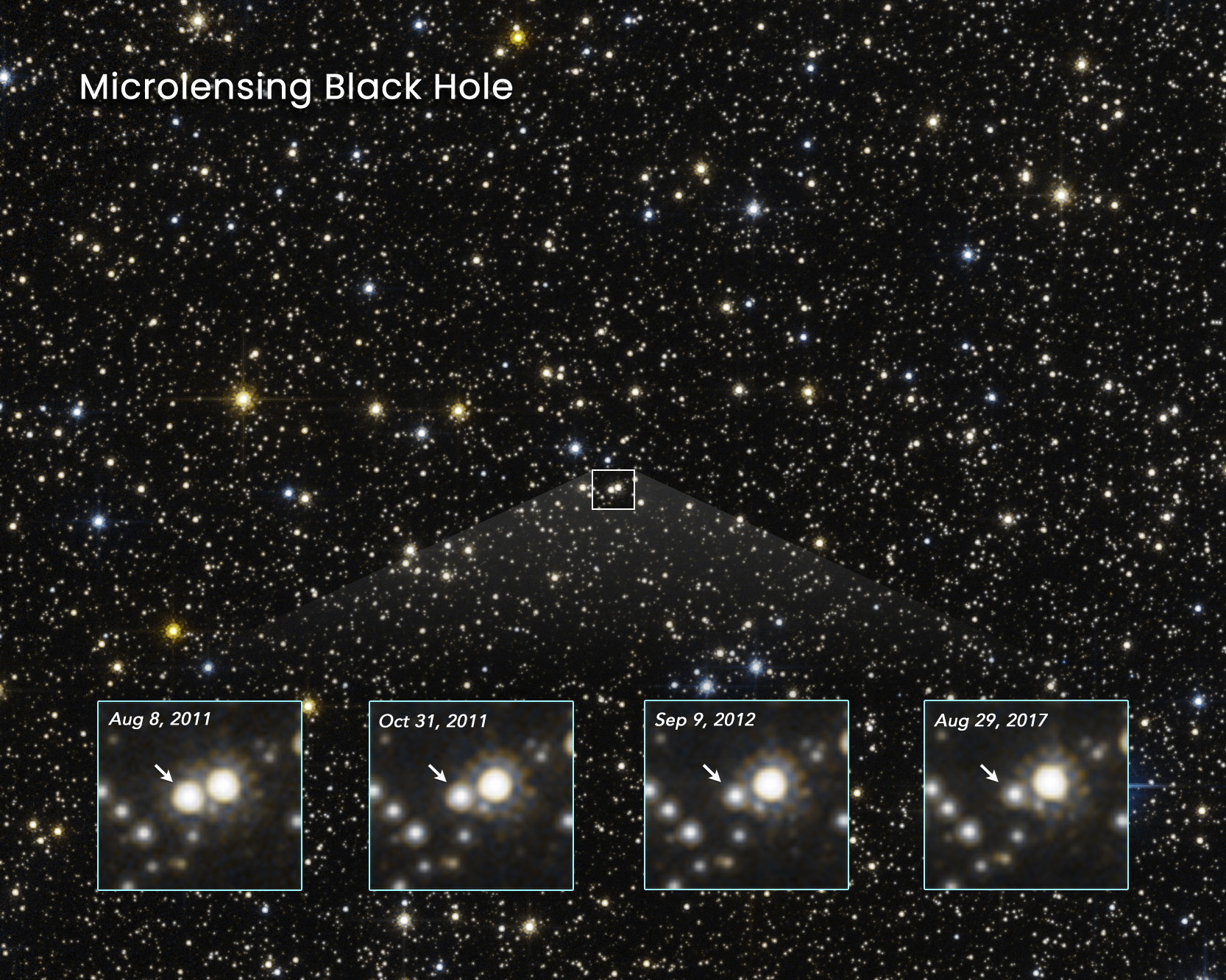 By observing a region of sky toward the galactic center over time, Hubble captured a large number of Milky Way stars and was able to tell how their brightness varied over time. One of those stars, highlighted in the inset panels from August of 2011 to August of 2017, brightened significantly but briefly: consistent with being caused by a microlensing event from a passing, intervening black hole. The observed microlensing rate is consistent with astronomers’ estimates that there are approximately 100 million roving black holes within our galaxy: not enough to account for the “missing baryons” required by the Universe.