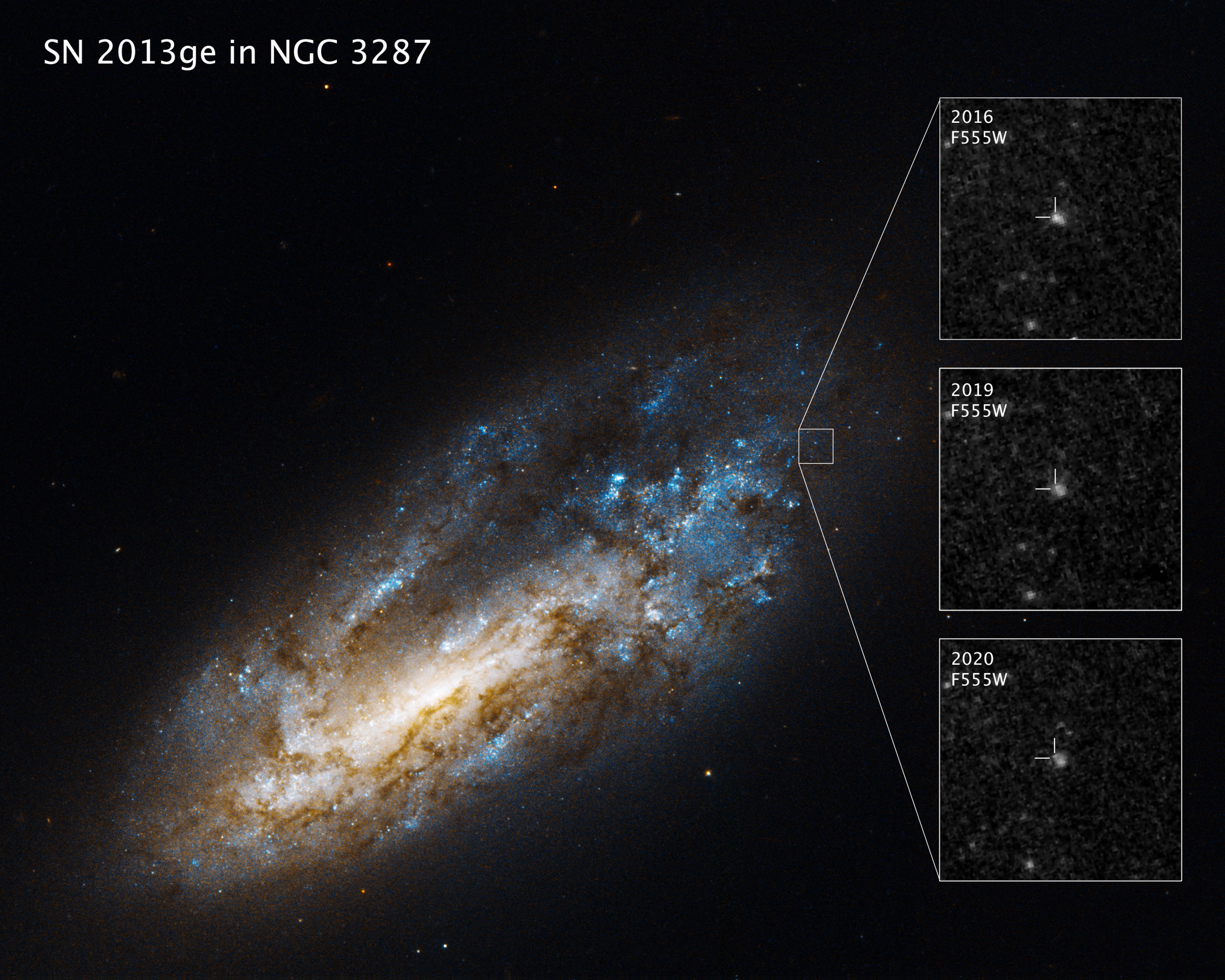 In 2013, a supernova went off in galaxy NGC 3287. Hubble imaged the galaxy and the location where the supernova went off many times over the subsequent years, identifying not just the fading supernova light but also a steady source of ultraviolet light: identified as the binary companion of the supernova’s progenitor.