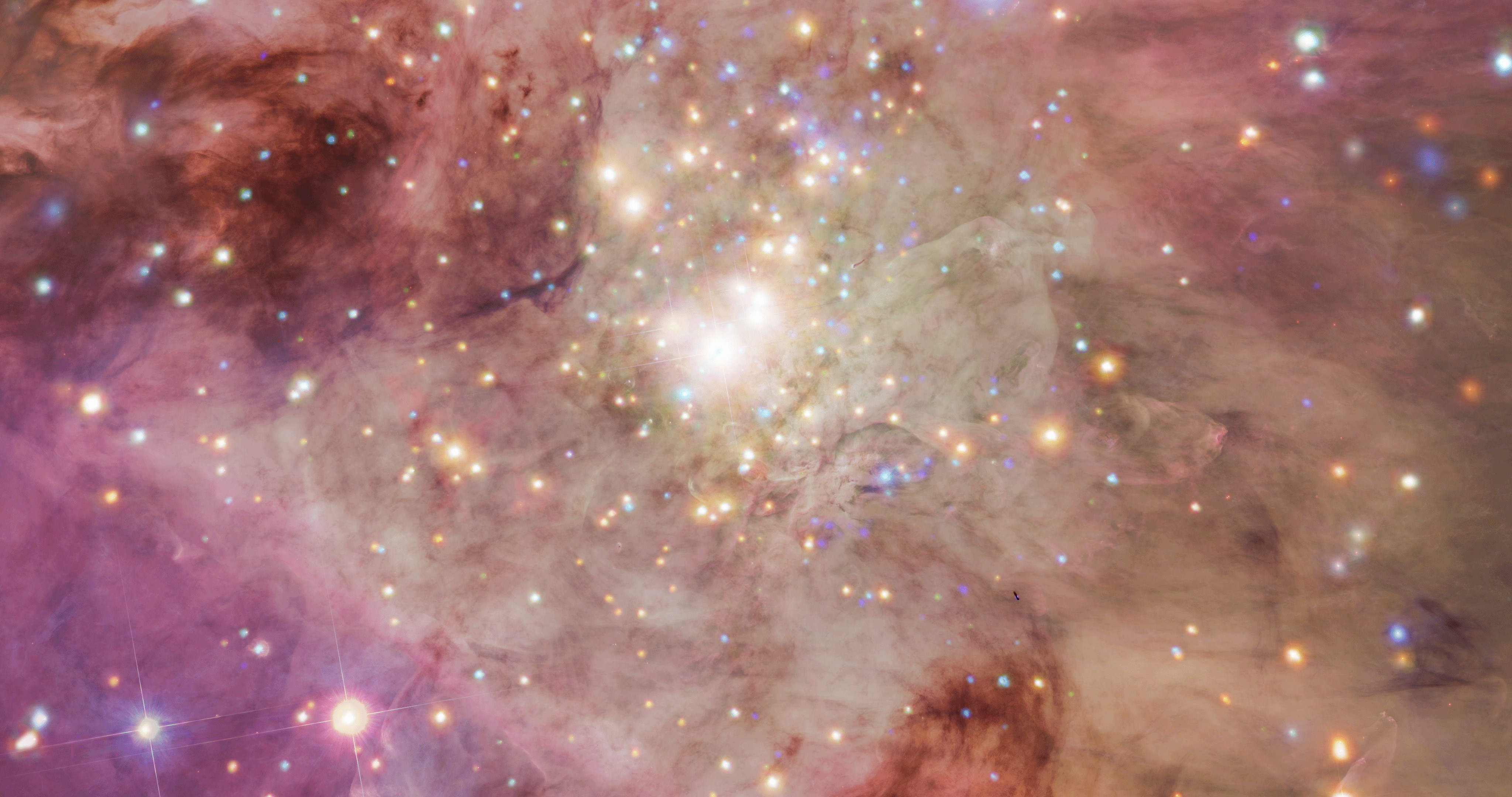 This composite visible light (dusty) and infrared (star-rich) view of the Trapezium cluster reveals the matter within the Orion Nebula as well as the brilliant stars inside. The Trapezium cluster is the largest, densest, brightest collection of stars inside the nearby Orion Nebula, although none of its stars are particularly ultra-massive individually.