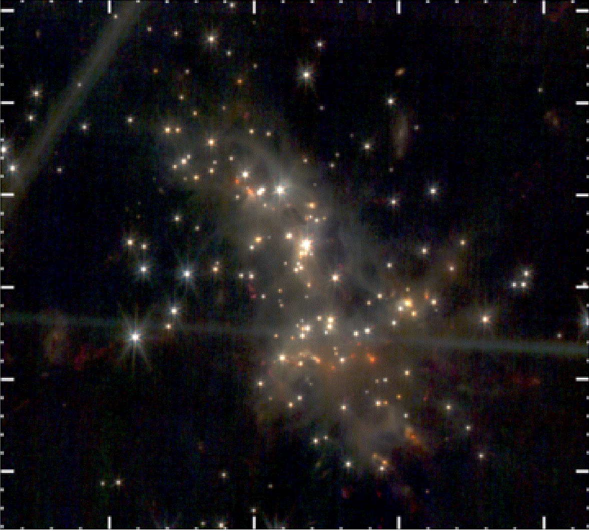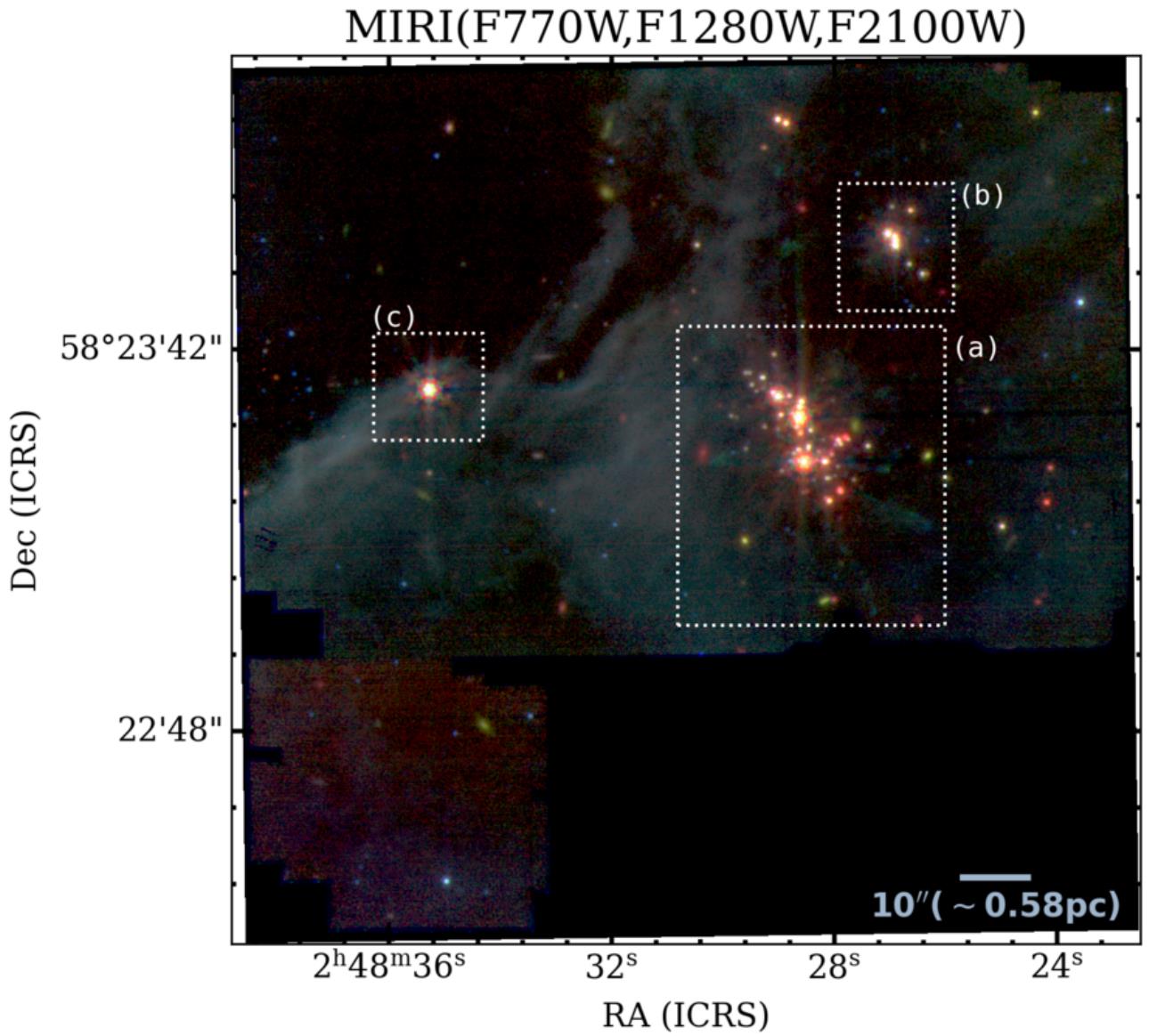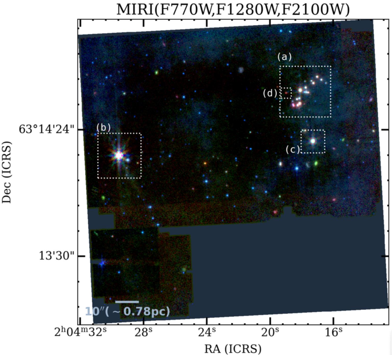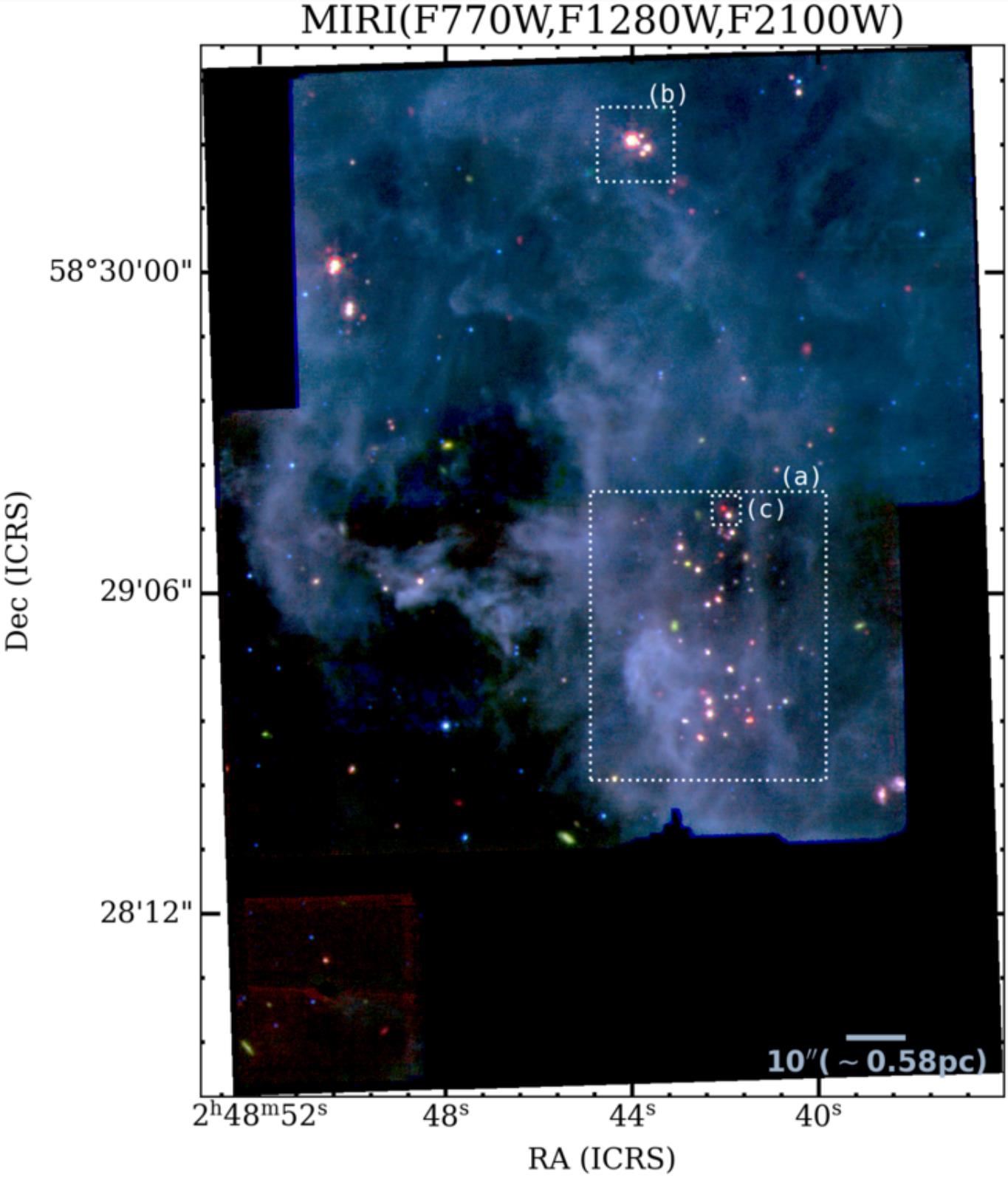 The largest star-forming region known, so far, within the extreme galactic outskirts of the Milky Way can be found in the box labeled “a” in this NIRCam image of Digel cloud 2s. This star cluster contains more than 100 member stars, as newly revealed by JWST’s unprecedented resolution.