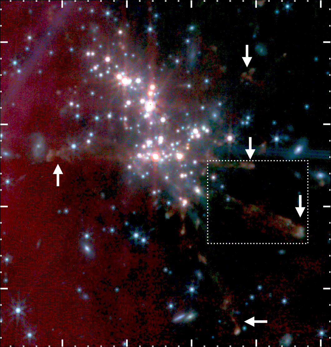 Located roughly 58,000 light-years from the galactic center, Digel cloud 2s, highlighted here, is found in the extreme outer galaxy of the Milky Way. The main cluster, glittering brilliantly, exhibits at least five independent protostellar jets, as highlighted by the white arrows.
