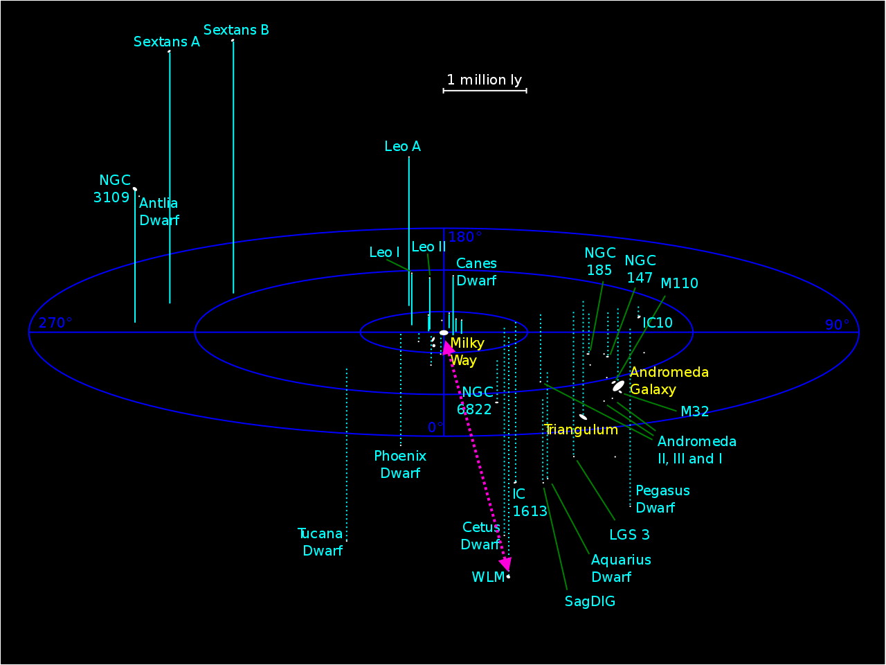 This map of many of the galaxies within the Local Group highlights the three biggest members: Andromeda, the Milky Way, and Triangulum. Galaxy WLM, shown at the bottom of the image, lies about 3 million light-years from the Milky Way and is extremely isolated. It contains some of the oldest, most pristine stars within our cosmic backyard, close enough to be resolved by observatories such as JWST.