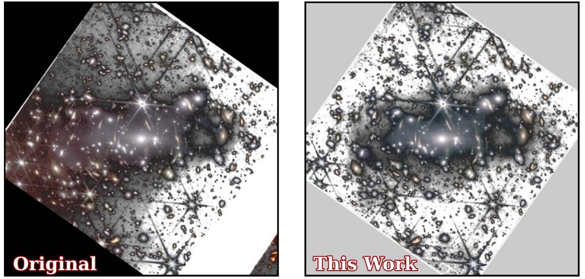 This 3-panel animation shows the original JWST deep field, a color-inverted version, and then a contrast/brightness enhanced version designed to bring out the intracluster light. By properly calibrating, processing, and analyzing this data, Montes and Trujillo were able to reveal two contributions, one toward the center and one toward the outskirts, to this observed intracluster light.