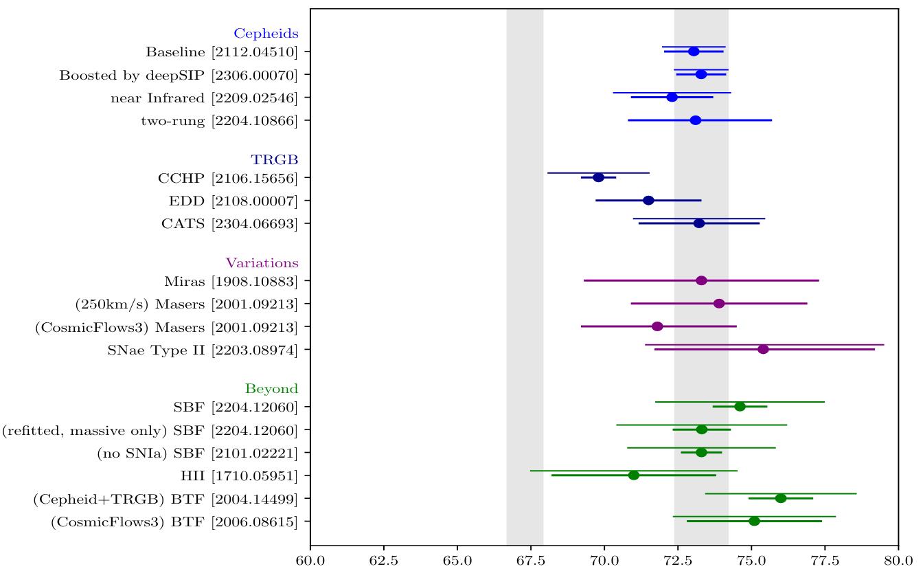 We can find large numbers of Cepheids, individually, in galaxies up to 50-60 million light-years away. The other types of stars can only be measured reliably out to much smaller distances. Similarly, type Ia supernovae can be reliably measured out to the greatest distances of any of the indicators except gamma-ray bursts, and so far all attempts to “standardize” gamma-ray bursts have not been successful. Thus, the parallax plus Cepheid plus supernova ladder is the only one with uncertainties that are small enough to actually tell the difference between whether the expansion rate is 67 km/s/Mpc or 73 km/s/Mpc.