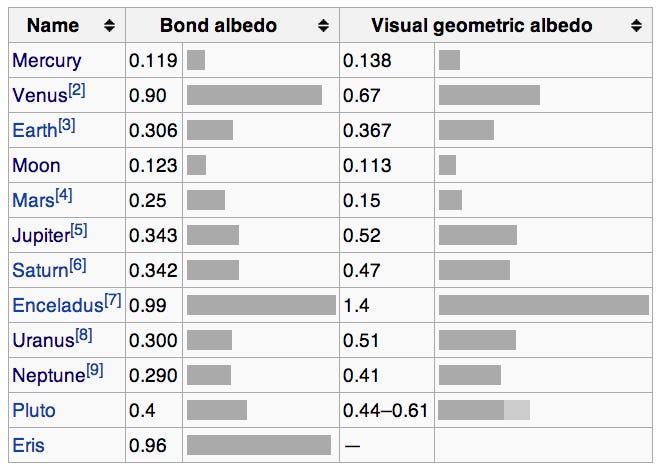 Don’t let the Moon’s white appearance fool you! The Moon’s average albedo is only about 0.12, which means only 12% of the light that hits it get reflected, while the other 88% gets absorbed. The lower an object’s albedo is, the better it is at absorbing light, which means the higher the albedo, the less sunlight actually gets absorbed. Mercury turns out to be similar to the Moon at 0.119, while Venus’ albedo is by far the highest of all planetary bodies in the Solar System at 0.90.